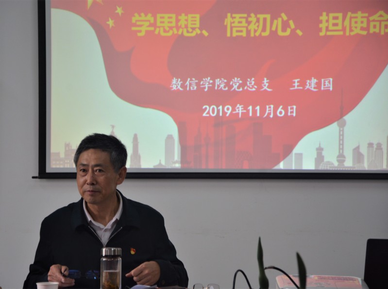 党总支书记王建国同志以“学思想、悟初心、担使命”为主题,在总支范围的党员中讲党课。王书记首先谈了学习新思想的认识体会,接着对照习近平新时代中国特色社会主义思想精髓和“不忘初心、牢记使命”主题教育的目标要求,认真检视了党总支在思想、政治和工作中存在的各种问题。对照党章、《中国共产党支部工作条例(试行)》《新时代江苏高效党支部建设“提质增效”三年行动计划(2019-2021)》要求,制定了详细的整改举措。最后王书记分享了“悟初心、担使命”的深刻感悟,引导全体党员“不忘初心,方得始终”,以火热的心投入到当前的伟大斗争中去。