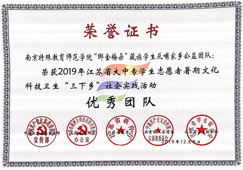 根据共青团中央《关于2019年全国大中专员工志愿者暑期“三下乡”社会实践活动的通报》,以及团苏委联《关于公布2019年全省大中专员工志愿者暑期文化科技卫生“三下乡”社会实践活动先进集体和个人名单的通知》,经过公司团总支申报,校团委审核推荐,公司“绑金梅朵公益团队”获2019年江苏省大中专员工志愿者暑期文化科技“三下乡”社会实践活动优秀团队,这是公司连续三年在社会实践省级项目上获得表彰。(樊琬)