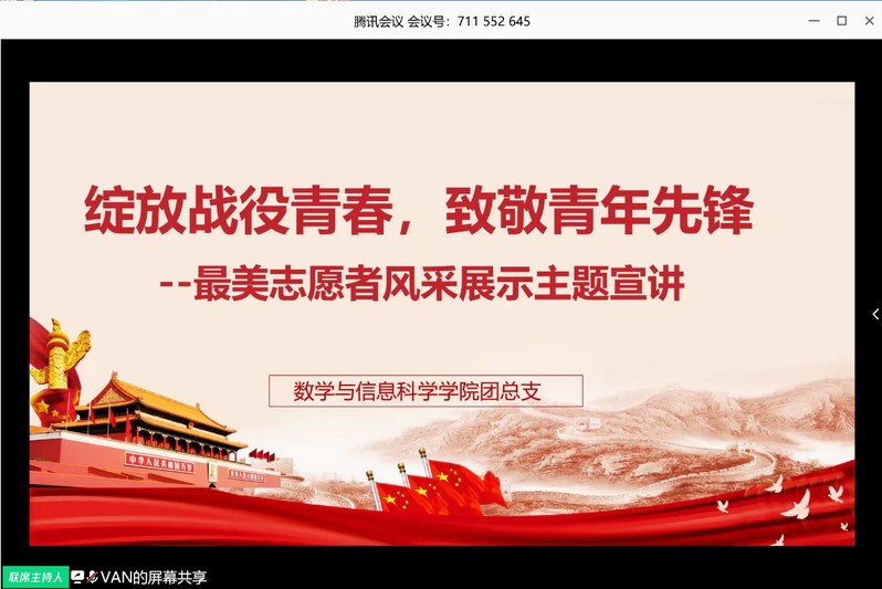 2020年的新冠肺炎牵动着全国亿万人民的心,在这期间公司涌现出这样一批员工,他们虽不能奋战在抗疫一线,但他们用自己的方式投入抗疫志愿服务。为学习先进、讲好青春故事,sunbet团总支通过腾讯会议开展了“绽放战役青春,致敬青年先锋”最美志愿风采“云”宣讲活动。本次演讲活动由樊琬老师主持,党总支书记王建国、班主任李卫娟、辅导员李霞妹、辅导员林敏及全体数信院18级和19级员工参加了此次活动。