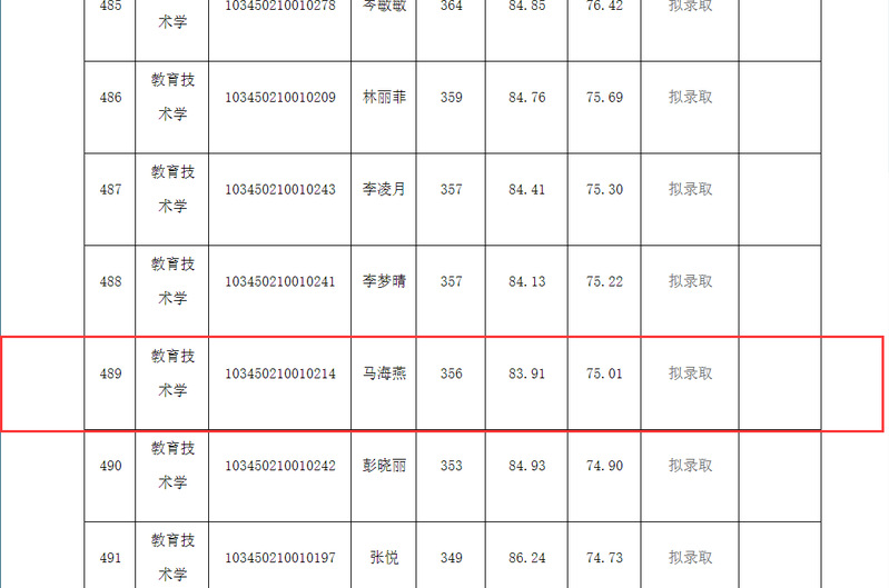5月19日,浙江师范大学教师教育公司公布了2020年硕士研究生统考招生拟录取名单,公司16级教育技术学专业员工马海燕拟被浙江师范大学教师教育公司教育技术学专业录取。