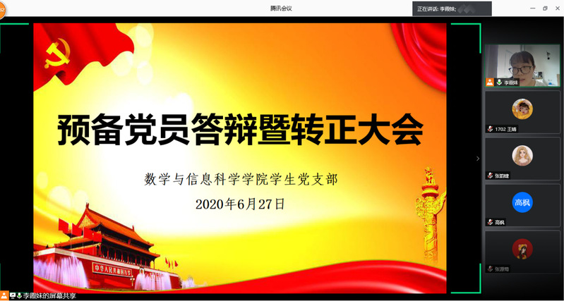 2020年6月27日下午2点,公司员工党支部在线召开预备党员答辩暨转正大会。支部全体党员以及入党介绍人蒋小艳老师、韩雪老师参加了会议。会议由员工党支部书记李霞妹老师主持。