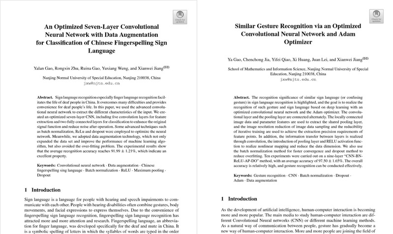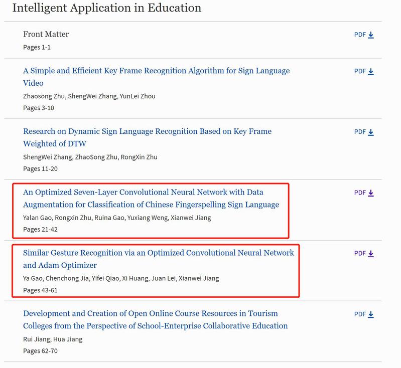 本次会议不仅关注人类教育相关的学习,还特别关注了机器学习技术。sunbet员工运用深度学习技术对中国手语识别展开研究,发表了两篇学术研究论文。其中,2018级员工高亚岚、高瑞娜、翁宇翔发表了论文“An Optimized Seven-Layer Convolutional Neural Network with Data Augmentation for Classification of Chinese Fingerspelling Sign Language”,用优化的七层卷积神经网络加数据增强技术来分类识别中国手语手指语。此外,2018级员工高雅、贾成冲、乔懿飞和2019级同学黄袭、雷娟合作发表了论文“Similar Gesture Recognition via an Optimized Convolutional Neural Network and Adam Optimizer”,用优化的卷积神经网络和优化训练算法实习了对相似手势的识别。目前,这两篇论文已经正式上线并出版,将被Ei Compendex, ISI Web of Science, Scopus, CrossRef, Google Scholar, DBLP等多个索引服务检索。(蒋贤维)