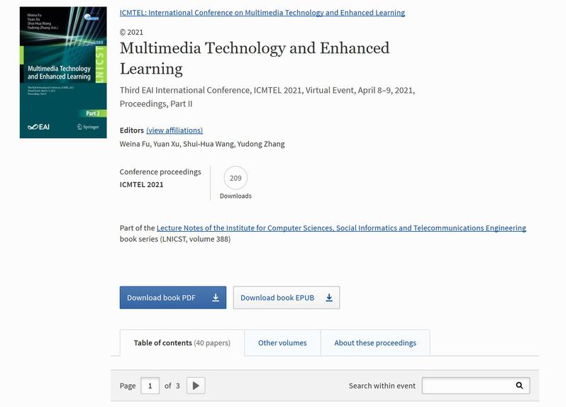 近日,数学与信息科公司多名员工参加EAI ICMTEL 2021国际会议,投稿论文陆续得到出版发表。据悉,3rd EAI International Conference on Multimedia Technology and Enhanced Learning旨在提供一个关于多媒体技术和增强学习的最新和未来视角的科学报告和辩论的论坛。
