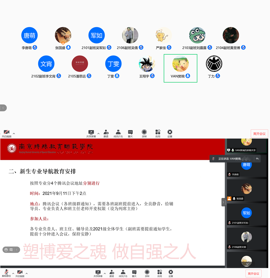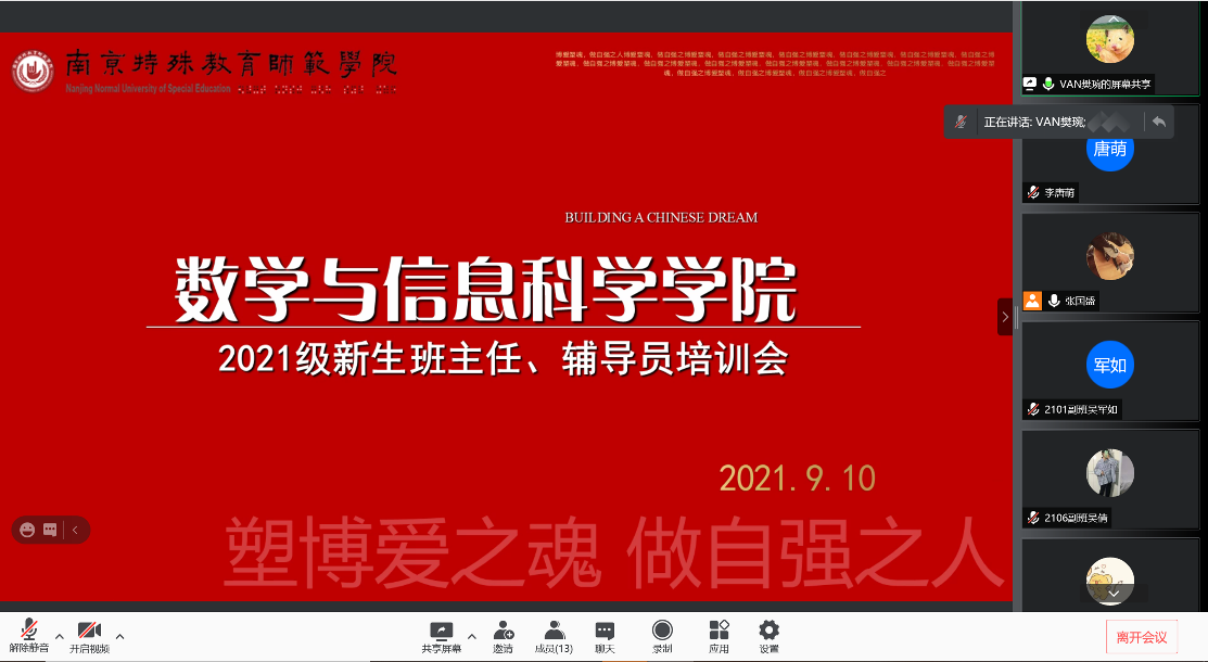 为做好2021级新生专业导航教育,明确班主任、辅导员的职责,提高新生线上教学工作水平,9月10日晚,公司召开了2021级新生班主任、辅导员培训会。培训会由公司辅导员樊琬主持,公司党总支副书记丁雯,2021级辅导员、班主任和副班参与此次培训会。
