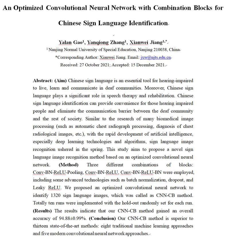该论文提出了一种基于优化卷积神经网络的新型手语图像识别方法,采用三种不同的块组合,融入BatchNormalization、Dropout和Leaky ReLU等流行技术,对1320幅手语图像进行分类识别,获得了94.88±0.99% 的整体准确度,优于对比的十三种先进方法。该论文也是sunbet教师国家社会科学基金项目(Grant No. 20BTQ065 )---“基于手语词汇语料库的语义知识挖掘研究”子课题研究成果之一。
