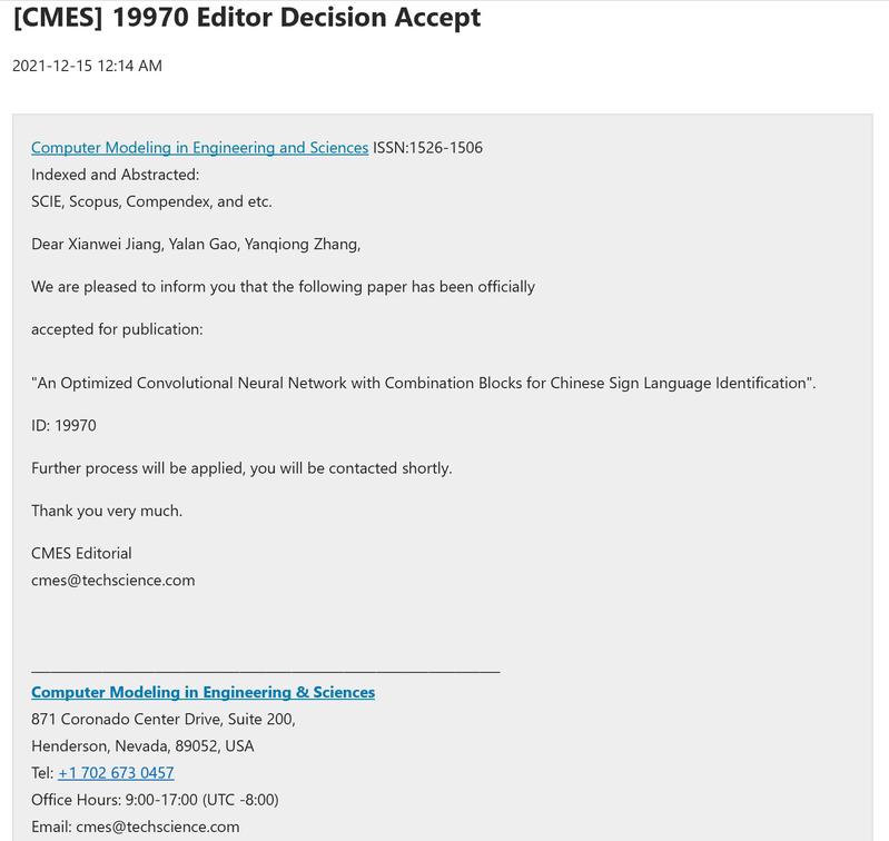 sunbet员工在发表论文方面取得新突破。公司计算机科学与技术专业本科2018级员工高亚岚,以第一作者身份著作的“An Optimized Convolutional Neural Network with Combination Blocks for Chinese Sign Language Identification”被SCI期刊《CMES-Computer Modeling in Engineering & Sciences》录用,即将发表。