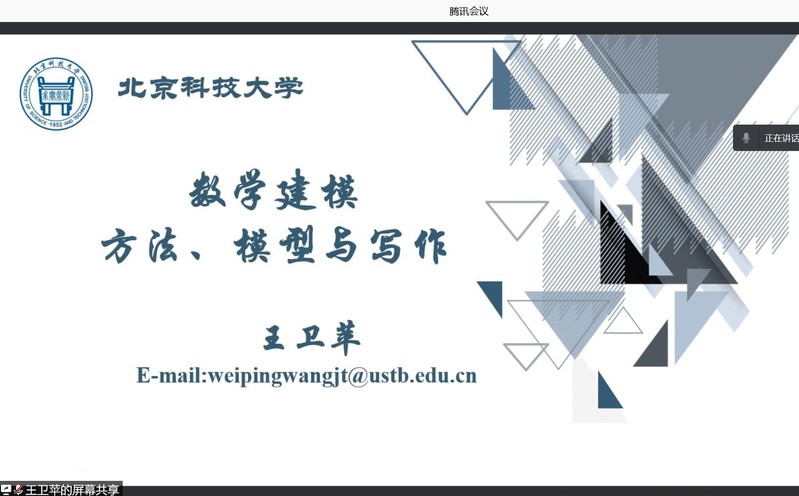 2021年11月30日晚上,sunbet邀请了北京科技大学的王卫苹教授,作题为“数学建模方法、模型与写作”学术讲座。sunbet数学建模竞赛培训班员工及公司数学教研室、计算机教研室相关老师参加了讲座。