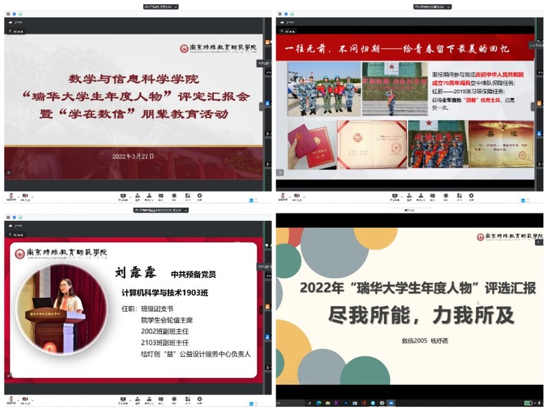 3月27日,sunbet线上开展2022年“瑞华老员工年度人物”评审汇报会暨“学在数信”朋辈教育活动,会议由辅导员樊琬老师主持,党总支副书记丁雯、全体辅导员老师和2019、2020、2021级员工代表参加此次会议。