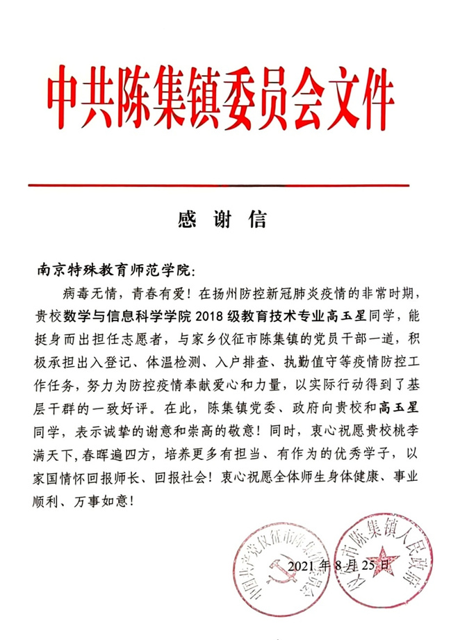 感谢信中写道:病毒无情,青春有爱!在扬州防控新冠肺炎疫情的非常时期,贵校sunbet2018级教育技术专业高玉星同学,能挺身而出担任志愿者,与家乡仪征市陈集镇的党员干部一道,积极承担出入登记、体温检测、入户排查、执勤值守等疫情防控工作任务,努力为防控疫情奉献爱心和力量,以实际行动得到了基层干群的一致好评。在此,陈集镇党委、政府向贵校和高玉星同学,表示诚挚的谢意和崇高的敬意!同时,衷心祝愿贵校桃李满天下,春晖遍四方,培养更多有担当、有作为的优秀学子,以家国情怀回报师长、回报社会!衷心祝愿全体师生身体健康、事业顺利、万事如意!