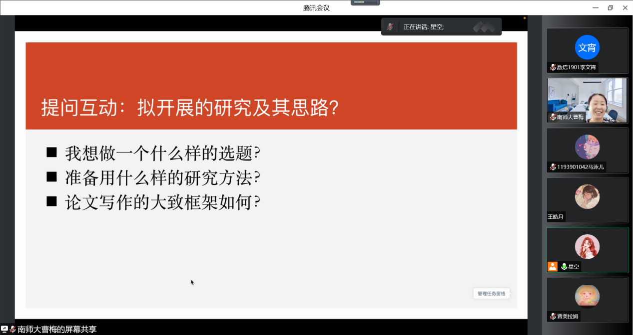 两个小时混合线上线下的讲座,氛围轻快、活跃,曹教授的分享,不仅打破了同学们对教育技术学研究的固有认知,更为大家提供了多种研究思路,提高了同学们的论文题目质量。(文/张居晓 王皓月)