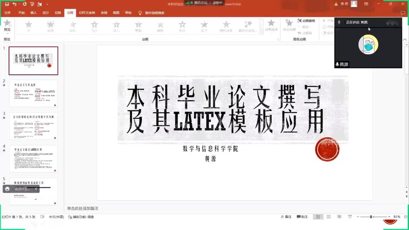 会议伊始,黄源老师先讲述了论文的组成结构,向同学们介绍了什么是LaTeX,并强调了LaTeX系统的写作编辑优势和基本特点,他指出,使用LaTeX只需使用一些组织文档结构的基础命令,非常容易生成专业的版面设计,比如脚注、交叉引用、参考文献、目录等,大大节省了论文排版的时间。
