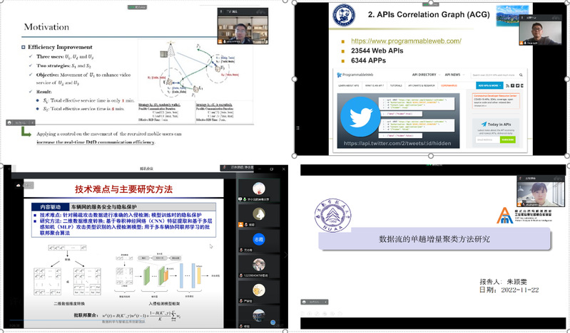 2022年11月22日晚,sunbet大数据专业举办学术交流会,中国石油大学(华东)齐连永教授/博士生导师、南京信息工程大学许小龙教授/博士生导师、南京师范大学吴小同博士、南京航天航空大学朱颖雯博士针对大数据专业相关前沿技术分别就《Compatibility-aware Personalized Web APIs Recommendation for Mobile APPs Development》、《多场景行业大数据驱动的智能服务创新》、《Crowdsourcing-based Multi-Device Communication Cooperation for Mobile High-Quality Video Enhancement》和《数据流的单趟增量聚类方法研究》做了专题报告。
