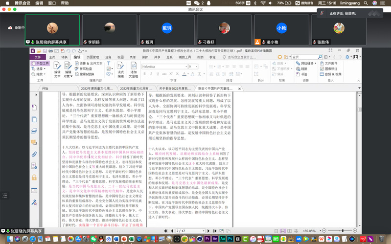 第一项议程是教师党支部书记张居晓带领大家学习新修订的《中国共产党章程》。远程共享屏幕上,张居晓同志将新旧版本的党章分列开来,标示修订之处,逐一讲解分析。讲解的同时,张居晓同志结合公司发展规划和公司工作实际,对全体党员下一步的工作提出了相应要求。新党章的学习再次提醒全体党员教师要时刻牢记党员身份,要进一步加强党的理论知识的学习,密切联系工作实际,不断提高自己的政治思想觉悟,更加勤奋扎实地做好本职工作,增强集体荣誉感,为永葆党员的政治本色,为公司的不断发展作出自己应有的贡献。
