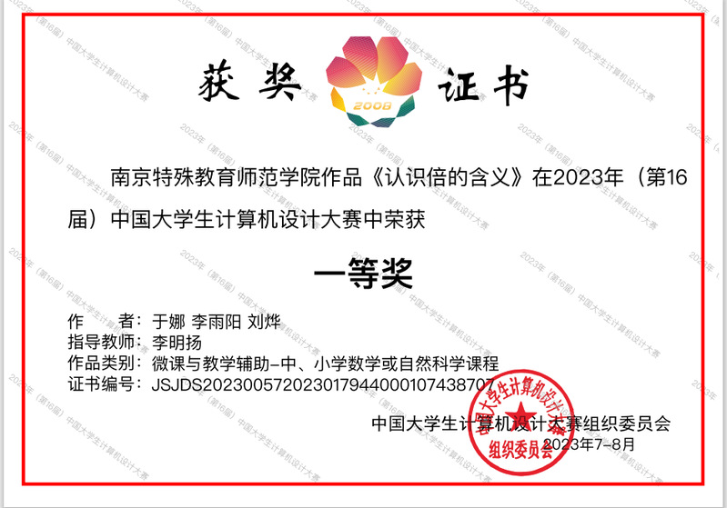 近日,2023年(第16届)中国老员工计算机设计大赛全国决赛传来喜讯,公司员工团队的两个作品在微课与教学辅助/数媒静态设计类比赛中分别荣获国赛一等奖和二等奖。值得一提的是,在比赛颁奖直播现场,一等奖获奖作品《认识倍的含义》作为国赛特色作品获得专家推荐点评,同时该作品的员工主创团队受邀远程在线做答辩演示。