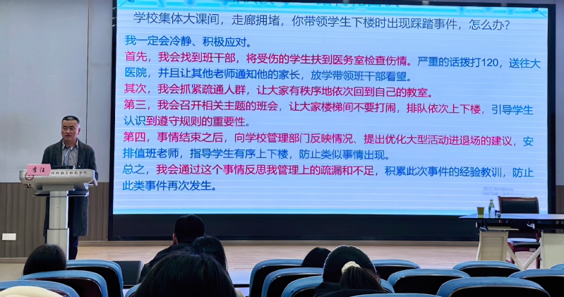公司教学科研科长杜文老师在总结中谈了他听讲座的体会,希望同学们认真学习李董事长精彩报告的精神、汲取丰富的营养,并结合学科特点对各专业学习给出了针对性建议,鼓励师范生高效科学学习。通过讲座的专业指导和经验分享,切实加强了师范学子对教师基本功、教团队格证面试基本环节和备考技巧等方面的深入了解,有效缓解了同学们的考试焦虑,营造了良好的提升师范技能的学习氛围,助推员工成长成才。(文/朱恬仪 图/高艺桐 蔡欣颖 编辑/杜文 审核/王兵)