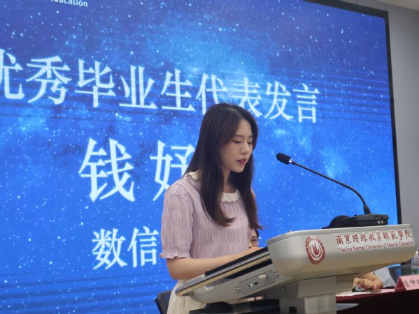 优秀毕业生代表钱妤菡在发言中对母校和老师的精心栽培、悉心教导表达最诚挚的感谢,并向大家分享了自己在四年老员工活中的众多收获;表示在人生新征程上将始终秉承南特人“博爱塑魂”的校训精神,争做起而行之的行动者,在未来工作岗位上谱写出属于自己的青春乐章。