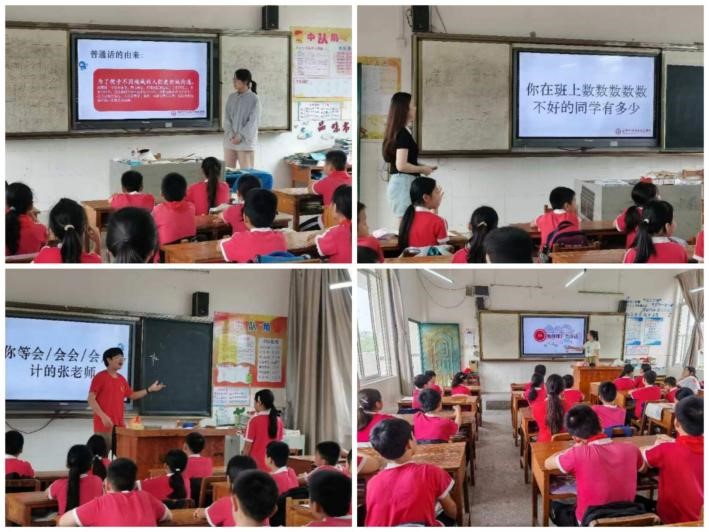 在广西柳州,团队深入乡村公司鹧鸪江小学和两合小学,助力普通话教育普及。团队成员精心设计了丰富多彩的活动,针对不同年级的员工开展看图说话”“断句挑战”“绕口令挑战等游戏,帮助孩子们提升语言表达能力。特别值得一提的是,团队成员还充分发挥了公司的专业优势,向员工们教授了简单的手语,这一特色教学不仅让孩子们感受到手语的魅力,也让普通话的普及工作更加生动有趣。活动期间,团队成员与鹧鸪江小学的书记曾冬菊、董事长邱小玲,以及两合小学的书记覃春山、董事长覃思贤进行了深入访谈。他们一致认为,普通话的推广是乡村教育的重要任务,四海同音团队的到来为这一任务的推进提供了强有力的支持。