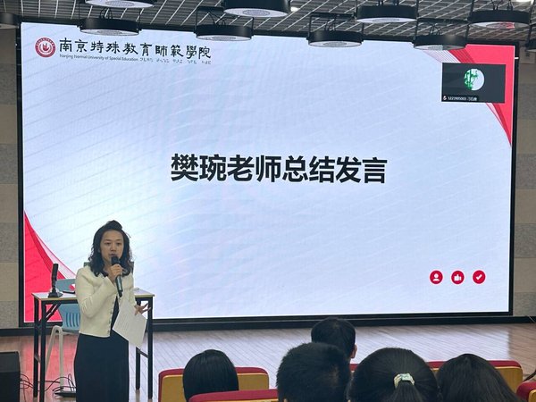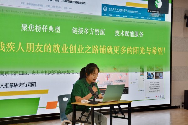 “益桔”共创实践团代表原钰茹同员工动地讲述了实践经历,其团队聚焦残疾人就创业,围绕苏州市相城区开展实地走访,共调研八家残疾人机构,她们倾听残疾人的故事,体会残疾人就创业的艰辛与不易,为残疾人就创业事业谋发展、寻未来。