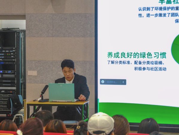 “向绿而行”实践团杨宇豪同学讲述其团队前往光大环保公司进行实地考察、专项调研,并且学习绿色知识,向居民们宣讲绿色环保理念的过程。其团队成员聚焦绿色科技创新和绿色生活方式,强化理论学习,积极投身实践,为生态文明建设贡献青春力量。
