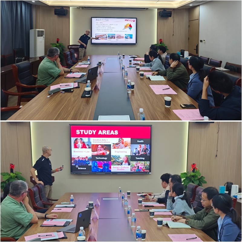 1030日下午,澳大利亚莫道克大学信息技术公司经理David Parry,中国市场经理Harry Sun和江苏领航人力资源服务集团国际事业董事总经理张舵一行三人来访,与公司在博雅楼3601会议室开展国际合作交流会议。公司党总支书记李贵希、副经理陈仲珊、党政办公室、教科研办公室、各系(教研室)主任、学科带头人参加了交流会,会议由副经理陈仲珊教授主持。