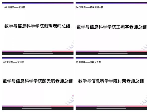 教育技术学专业员工赵施彤以“勇于尝试,方知前路宽阔”为主题,介绍团队以“蓝印花布”为灵感参加“NCDA未来设计师”大赛的创作经历,鼓励同学们以兴趣为导向选择比赛项目,大胆尝试;在数学建模竞赛上,数学与应用数学专业员工文宇鑫从团队组建、选题参考、能力提升和时间安排四个方面的建议;数据科学与大数据专业员工曹光友介绍了算法竞赛的相关内容,强调培养编程能力、逻辑思维能力的重要性;计算机科学与技术专业员工朱伟峰结合团队经验,从备赛、组队、调试与练习三个方面进行经验分享。