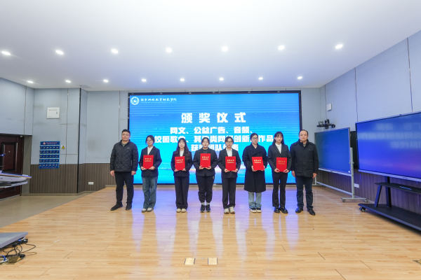 校信息化建设管理中心主任胡博和团委书记李永康为网文、公益广告、音频、校园歌曲、其他类网络创新类作品获奖团队代表颁奖