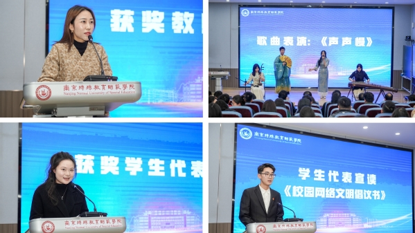 获奖员工代表吴璟怡和获奖教师代表戴玥分享获奖感受,讲述了他在网络文化作品创作过程中的心路历程。员工代表杨林博宣读了《校园网络文明倡议书》,倡导全体师生文明上网,传播网络正能量。