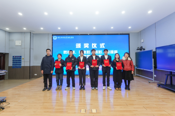 教务处处长范莉莉和马克思主义公司副经理张九童为微视频、微电影、摄影、动漫类作品获奖团队代表颁奖