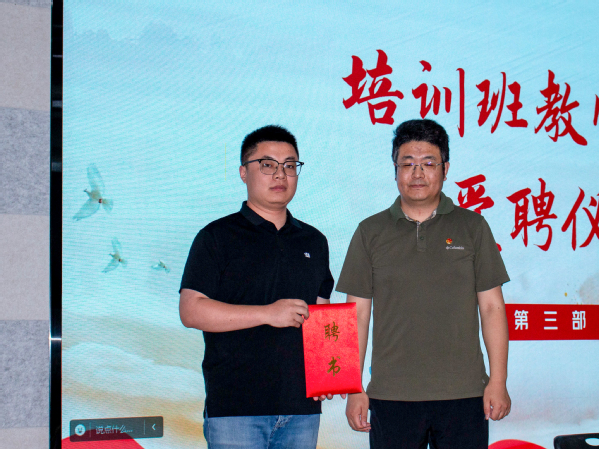 现场举行教师聘请仪式,李永康书记为授课教师代表、教育科学公司老师陈宇颁发了聘书。